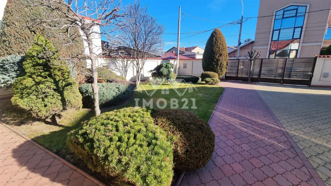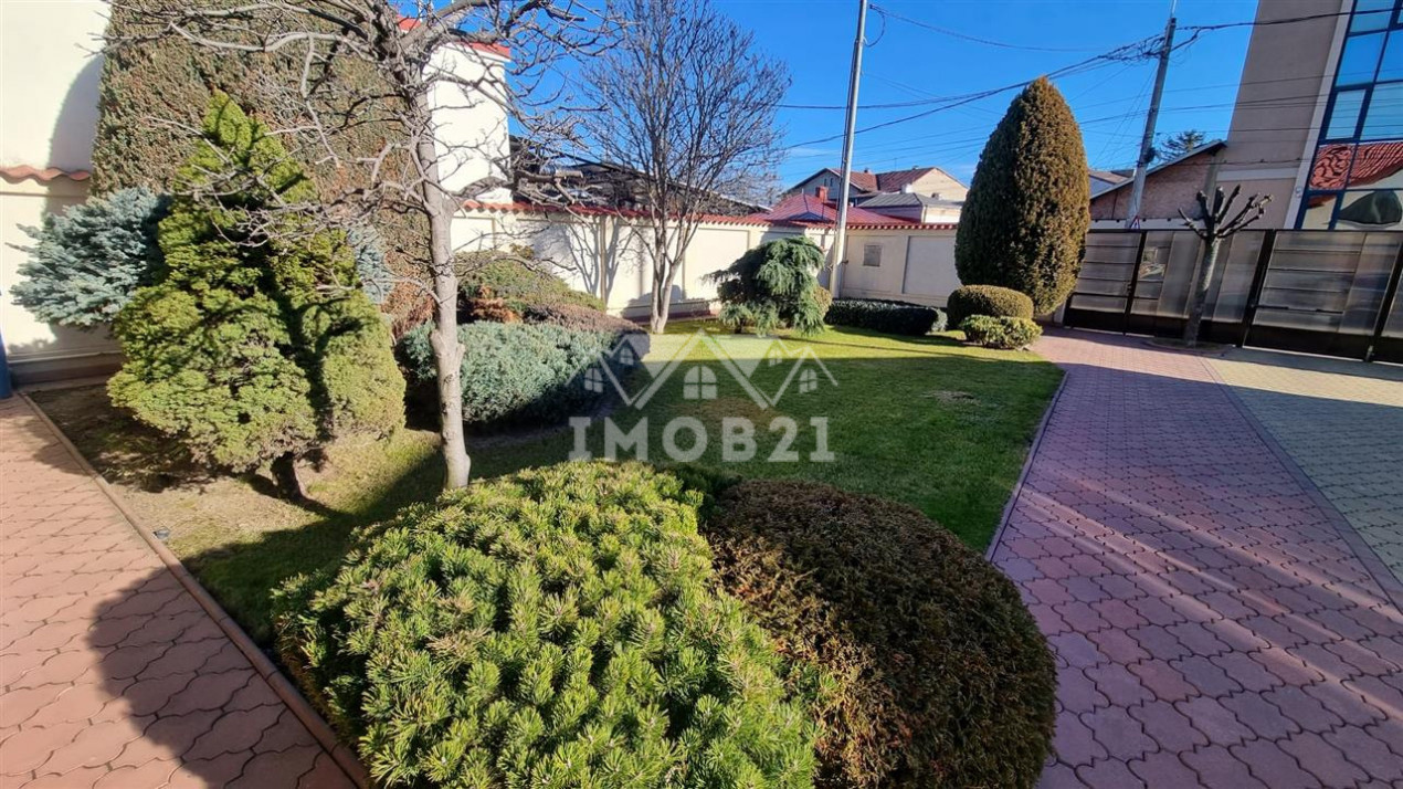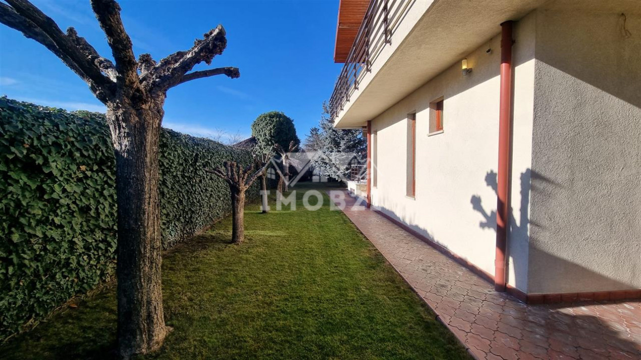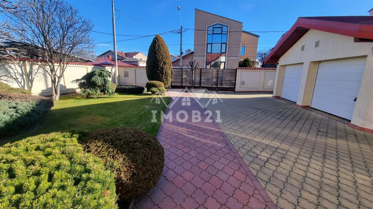 Imobilul are doua intrari fata-spate curtea este imprejmuita cu gard din beton este pavata cu dale si este frumos amenajata ca si gradina cu gazon arbusti si plante ornamentale: are doua garaje si dispune de patru locuri de parcare beci piscina exterioara si o casuta intima din lemn in gradina.