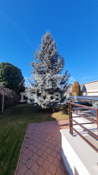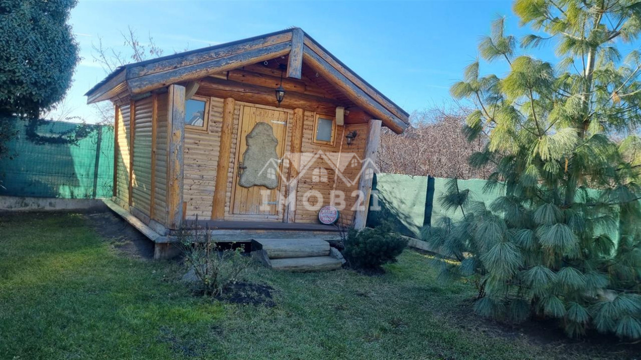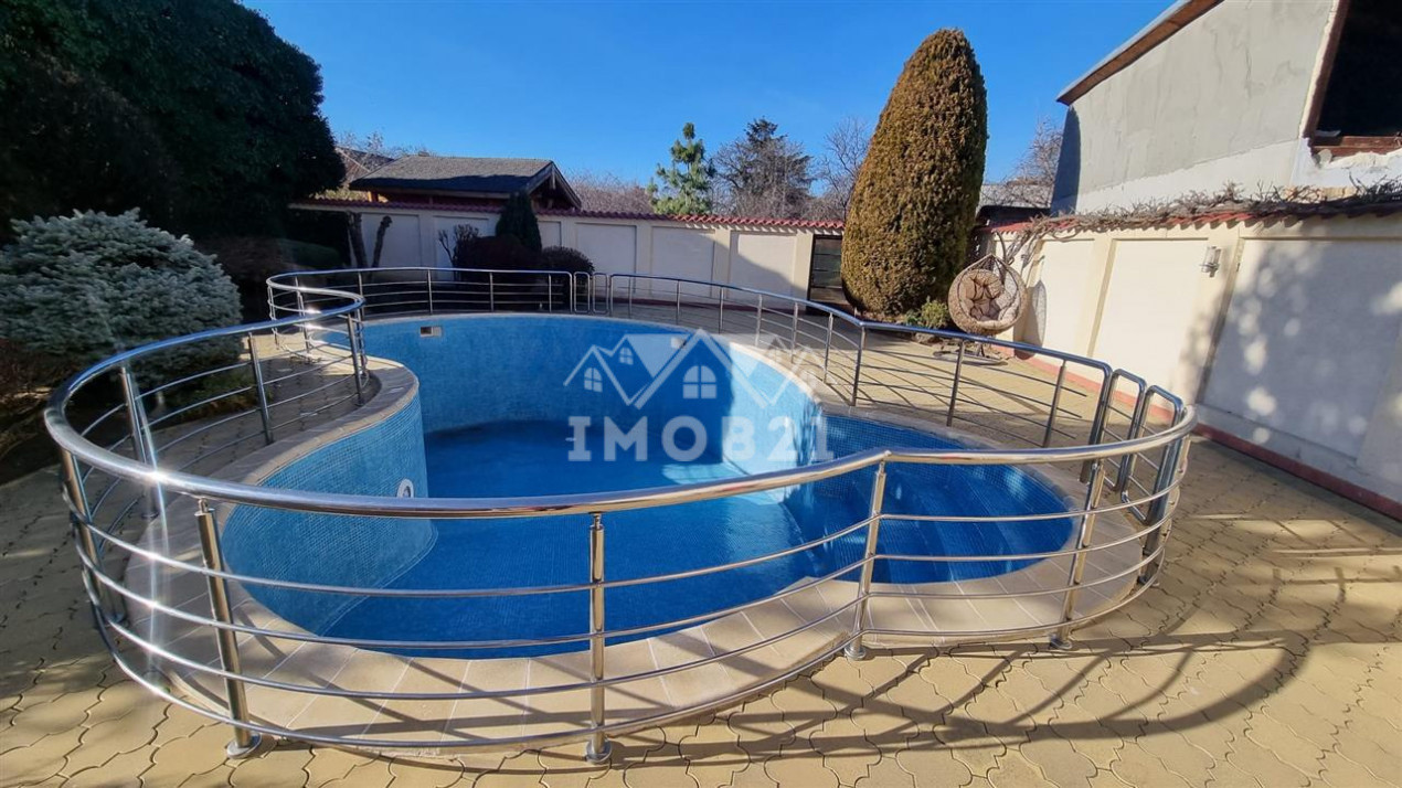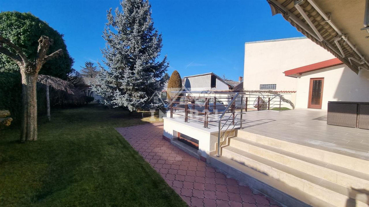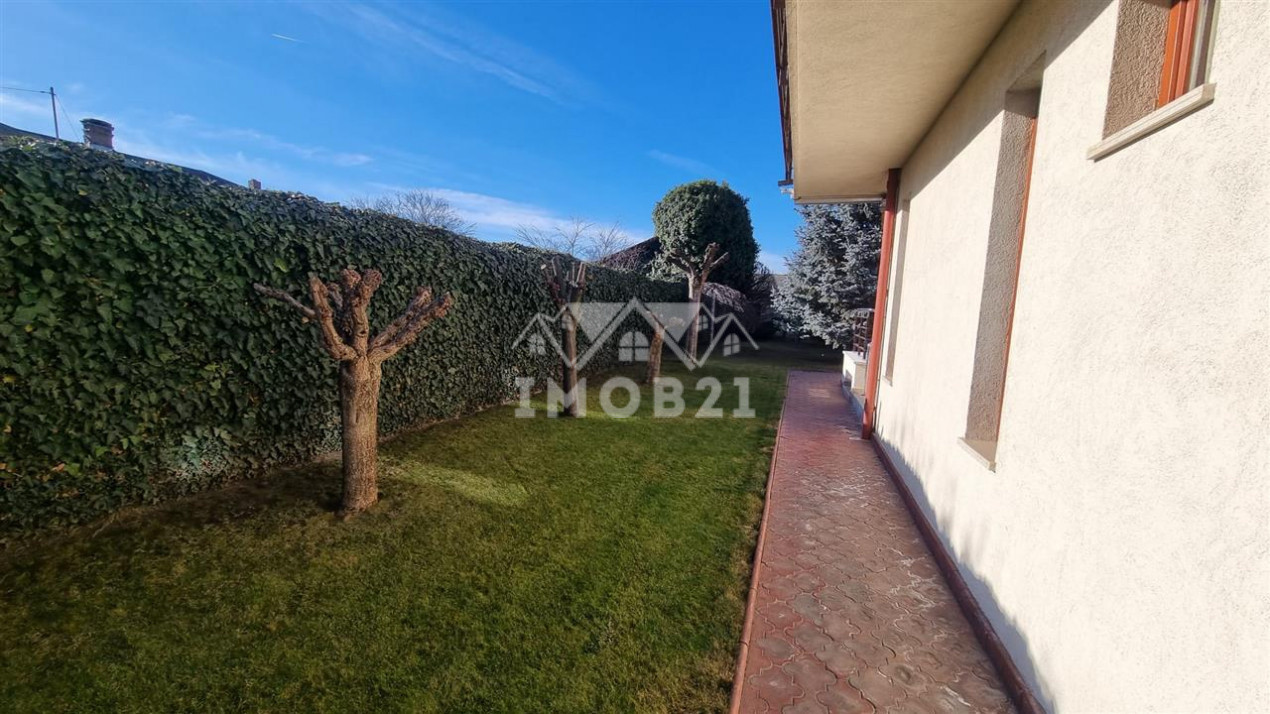 Imobilul are doua intrari fata-spate curtea este imprejmuita cu gard din beton este pavata cu dale si este frumos amenajata ca si gradina cu gazon arbusti si plante ornamentale: are doua garaje si dispune de patru locuri de parcare beci piscina exterioara si o casuta intima din lemn in gradina.